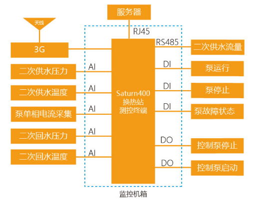 一次網(wǎng)監(jiān)測由Saturn400換熱站監(jiān)測終端負(fù)責(zé)一次回路數(shù)據(jù)的采集與執(zhí)行,并由Saturn400換熱站監(jiān)測終端負(fù)責(zé)上、下通訊,通過RJ45端口或3G與換熱站監(jiān)控中心、公司調(diào)度中心進(jìn)行通訊。其功能框圖見下圖所示: