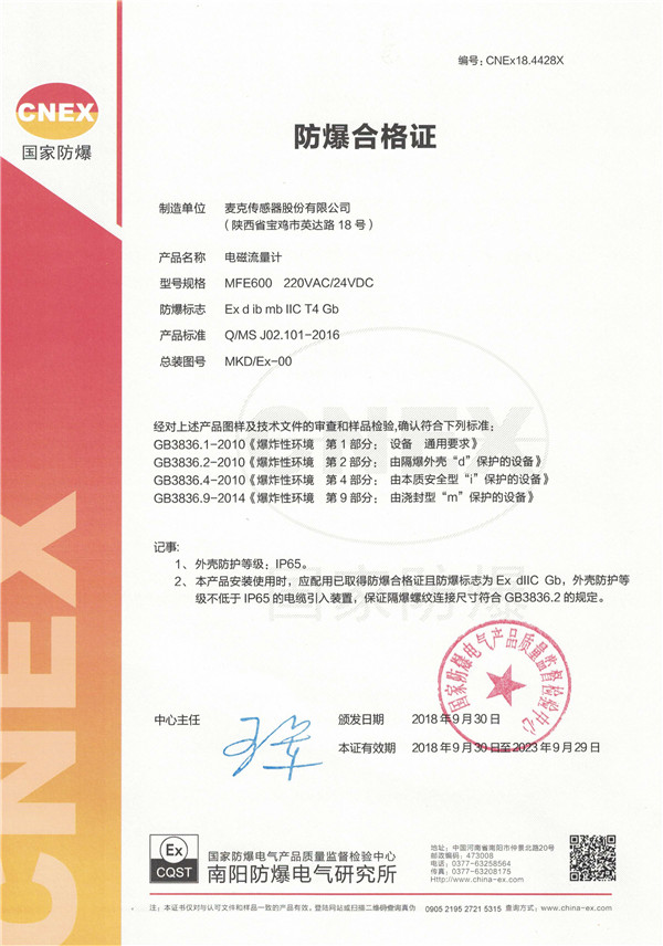 麥克傳感MFE600 220VAC/24VDC型電磁流量計(jì),通過(guò)國(guó)家防爆電氣產(chǎn)品質(zhì)量監(jiān)督檢查中心審查,取得防爆合格證。