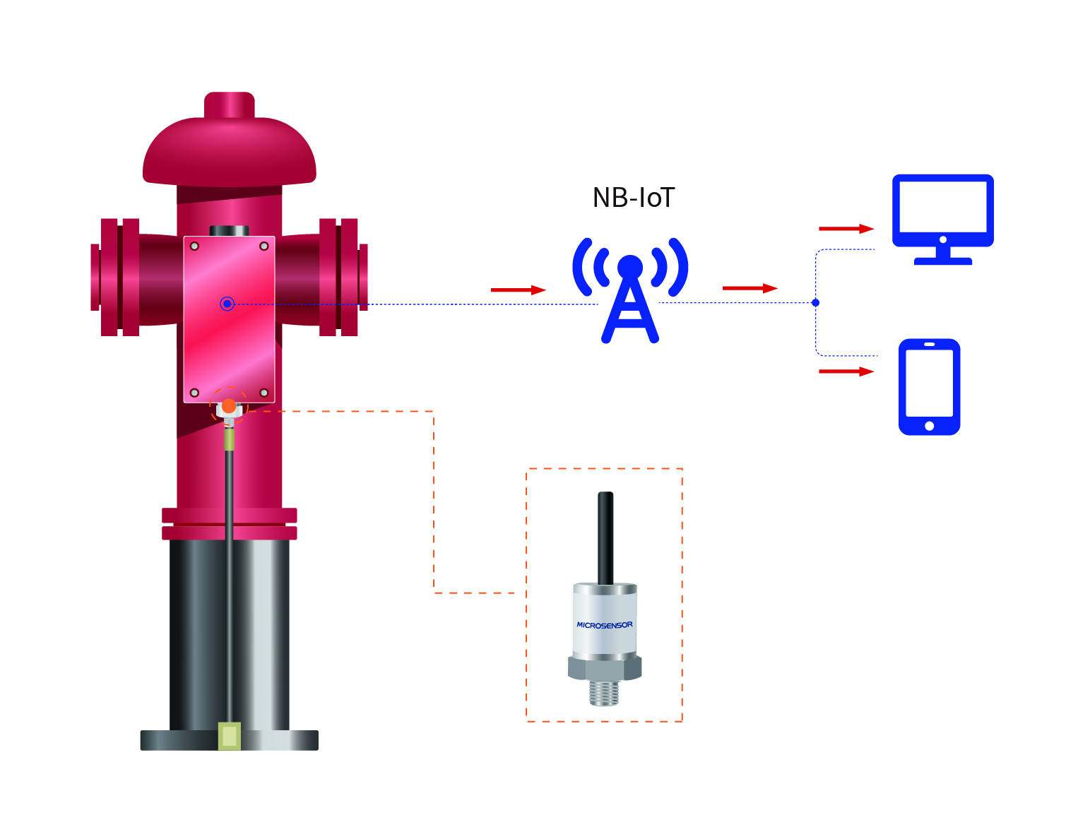 在消防栓安裝硅微熔壓力傳感器,對(duì)消火栓內(nèi)部壓力進(jìn)行實(shí)時(shí)監(jiān)測(cè),并通過無線監(jiān)測(cè)終端和無線網(wǎng)絡(luò),將數(shù)據(jù)發(fā)送至云平臺(tái)進(jìn)行數(shù)據(jù)統(tǒng)計(jì)分析。當(dāng)異常發(fā)生時(shí),及時(shí)定位問題點(diǎn)位并發(fā)送告警信息。