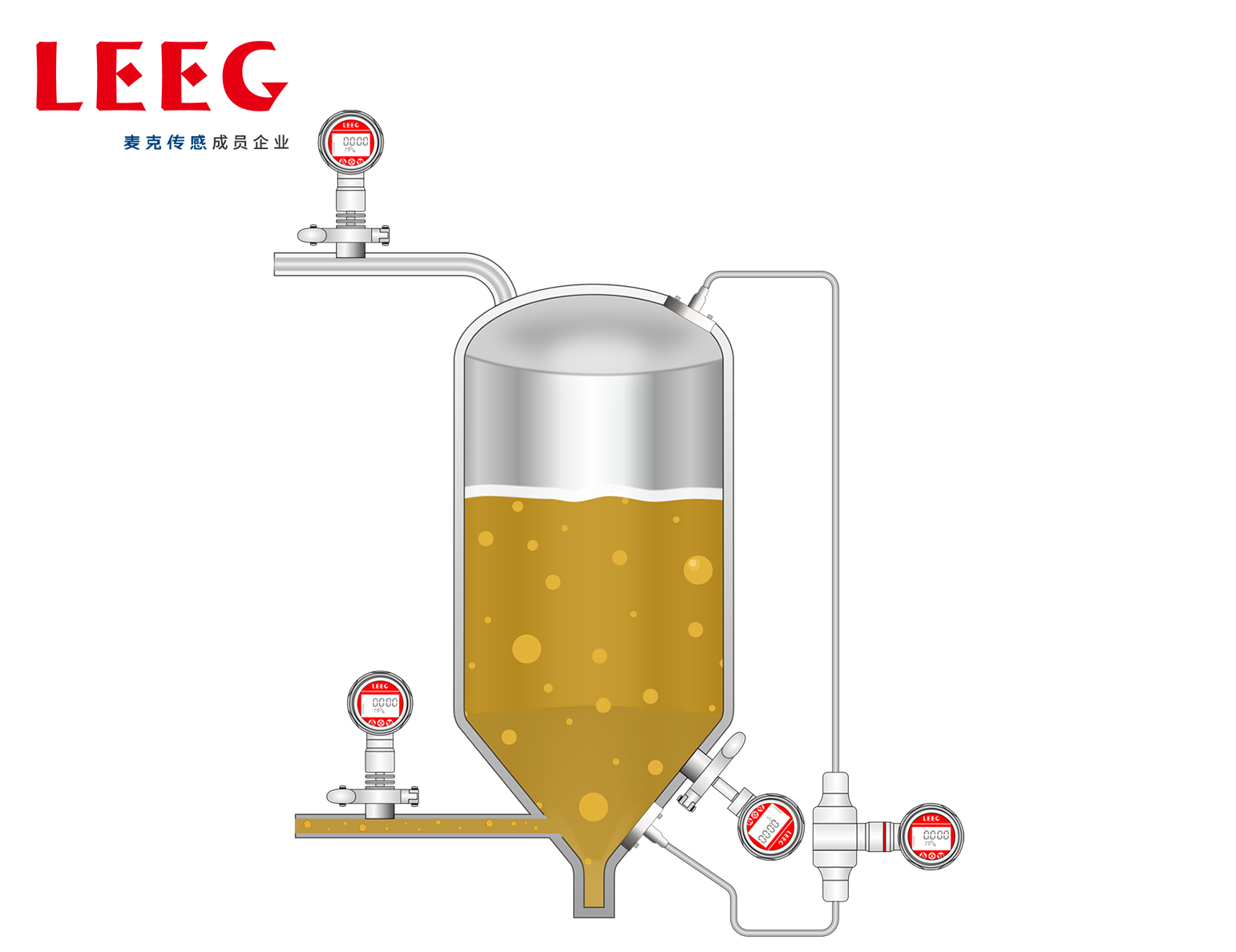 當麥汁冷卻到適宜溫度后,加入酵母,開始發(fā)酵。在這個過程中,酵母會將溶解在麥汁中的麥芽糖轉化成二氧化碳和酒精。為了實現(xiàn)優(yōu)質的發(fā)酵過程,需要測量發(fā)酵罐中麥汁的溫度和液位,測量回收管中的CO?和酵母管中的壓力。